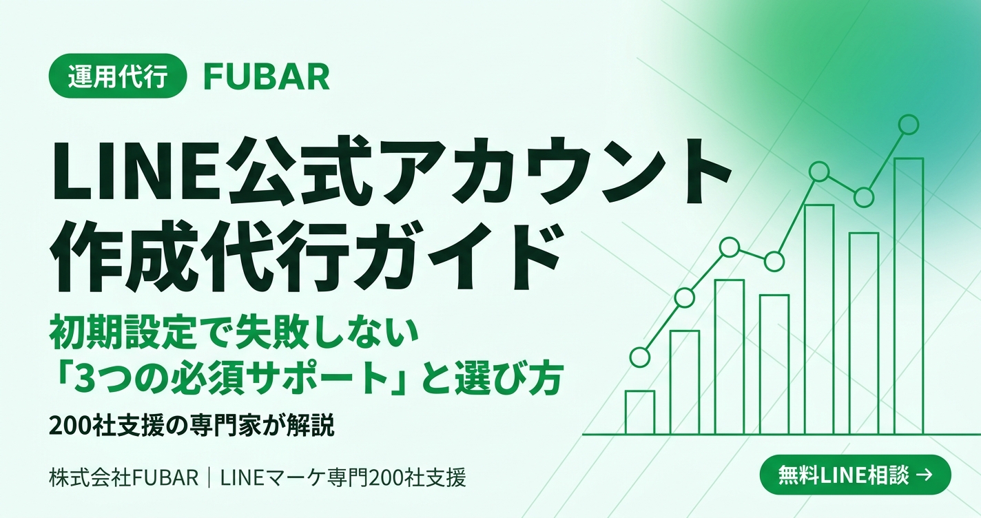 A. 初期設定のみの代行であれば5万円〜15万円、認証済みアカウント申請やリッチメニュー設計、あいさつメッセージの戦略設計まで含めると20万円〜50万円が相場です。FUBARで200社を支援してきた経験から言うと、金額だけで選ぶと「設定して終わり」の代行業者に当たりやすく、運用開始後に成果が出ないケースが結構多いです。初期費用に加えて、開設後3ヶ月程度の運用サポートが含まれているかを必ず確認してください。