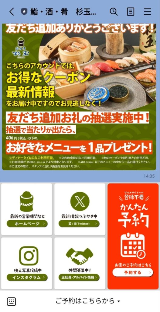 『鮨 酒 肴 杉玉』ではリッチメニューに予約ボタンを設置し、他のメニューと比べて予約ボタンが目立つように大きく掲載しました。