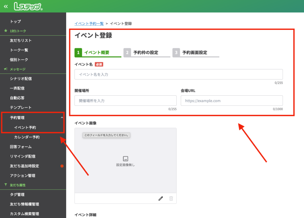 左のタブにある『予約管理』をクリックし『イベント予約』を選択する